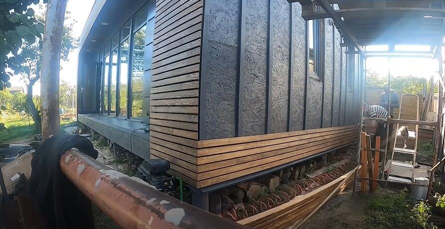 После выставления первой рейки двигаемся вниз от нее. Расстояние между досками составляет 12 мм. Такая дистанция была установлена экспериментальным путем. Если оставлять расстояние меньше, будет перерасход материала и выглядеть это будет не очень привлекательно. Если больше, то будет сильно заметна обрешетка. При оставлении дистанции 12 мм она тоже видна, но не бросается в глаза. На расстоянии от дома ее и вовсе незаметно.