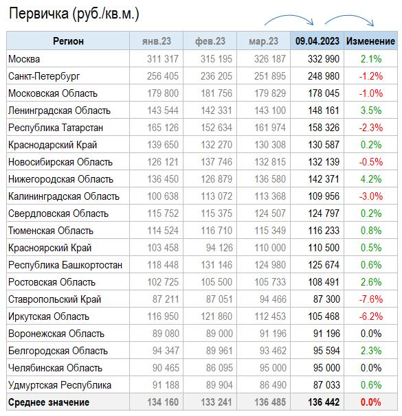 Продолжаю традиционный воскресный мониторинг недвижимости. За 9 дней Апреля рублевые ценники первички и вторички в двадцати самых живых регионах по данным Домклик изменились так: