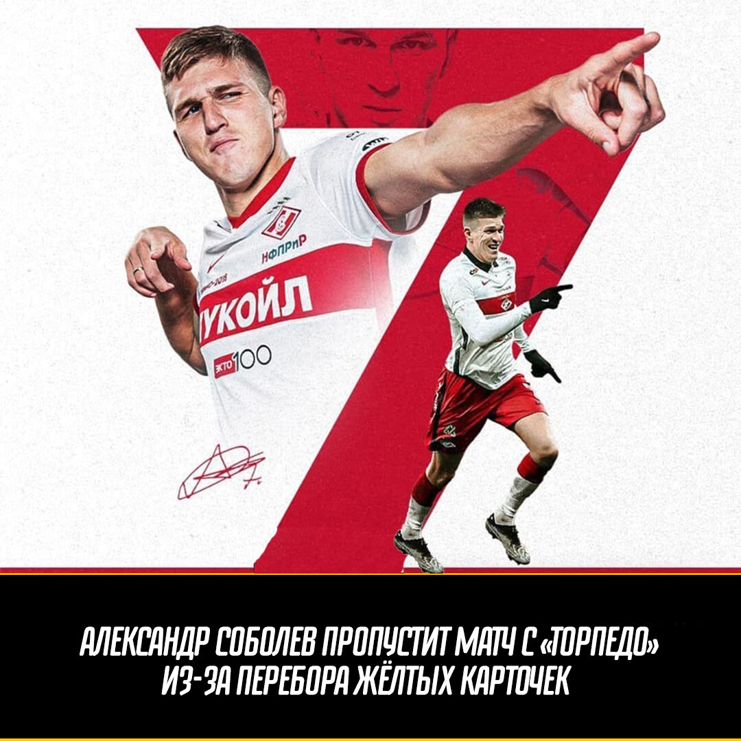 👀 Спартак остается без своего основного нападающего Александра Соболева, нападающий красно-белых, не сможет принять участие в ближайшем матче 23-го тура РПЛ против "Торпедо". Причина - перебор желтых карточек.
