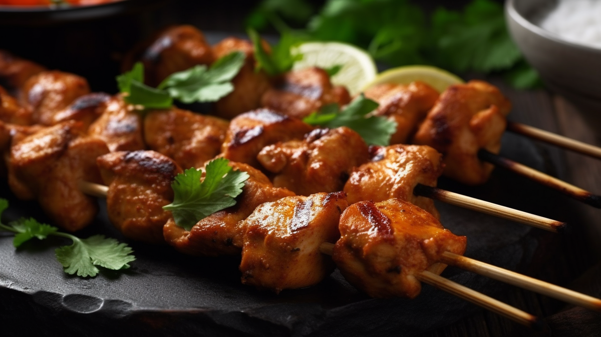 - Готовь куриные шпажки на гриле в течение 10-12 минут, периодически переворачивая, пока курица не прожарится и не приобретет слегка обугленный вид.