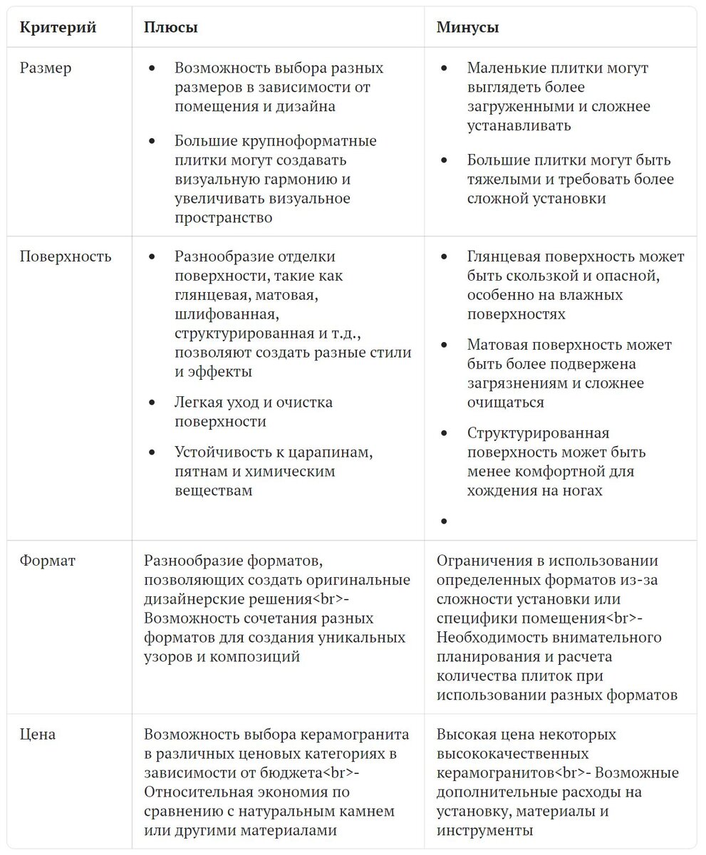 Для выбора керамогранита, который наилучшим образом соответствует вашим требованиям, рекомендуется следовать следующей инструкции: Вот пример таблицы для выбора керамогранита: Надеюсь, эта статья и предложенная таблица помогут вам с выбором керамогранита и созданием стильного и практичного интерьера! #керамогранит #выборматериала #дизайнинтерьера #полыизкерамогранита #строительство #ремонт #материалыдляотделки #стильныйинтерьер #интерьерныйдизайн #керамическиеплитки #керамическийгранит #интерьерныетенденции #дизайнпола #декордлядома #сравнение #плюсыиминусы #инструкцияповыборукерамогранита