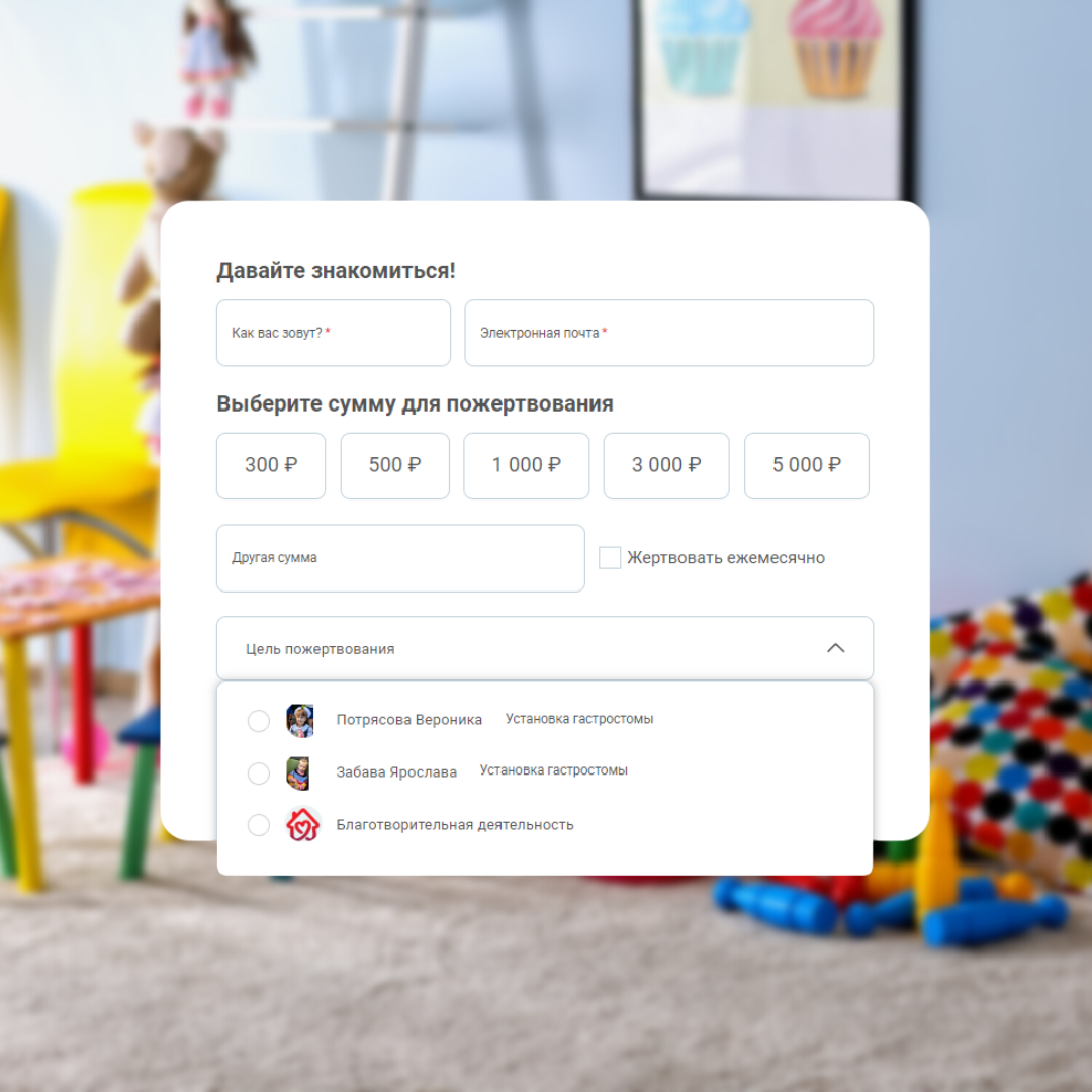 На данный момент у Благотворительного фонда "Хофф" открыто четыре сбора: Вы можете сделать пожертвование на САЙТЕ Фонда "Хофф", выбрав цель пожертвования и удобную для вас сумму.