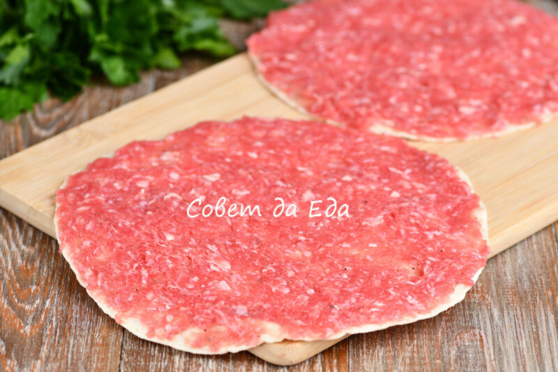 2. Говяжий фарш перемешиваем с солью и молотым перцем. На 2 лепешки с помощью большой ложки тонким слоем распределяем фарш (по 62-63 г).