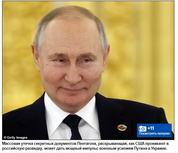 Утечка секретных документов из Пентагона свидетельствует о том, что США шпионили за российской разведкой, потенциально обеспечивая Владимиру Путину поддержку в его военных действиях на Украине. Документы, хотя их срок давности составляет до нескольких месяцев, содержат подробные сведения о том, какие российские разведывательные службы были наиболее скомпрометированы, а также подсказки о том, как США добыли так много секретной информации о Кремле. Считается, что американские шпионы также глубоко проникли в российскую разведывательную службу ГРУ и выяснили, насколько плохо идут военные действия Путина. Однако официальные лица говорят, что утечка может повредить военным усилиям Украины, раскрыв то, что США знают о российской военной машине, и дав Кремлю возможность перекрыть источники информации. Утечка документов, распространенных в Интернете, по крайней мере, некоторые из которых считаются подлинными, состоят из фотографий распечатанных листов бумаги. Сообщается, что чиновники Пентагона