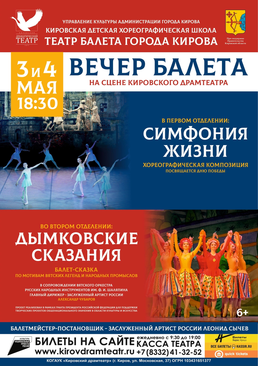 3 и 4 мая 2023 года на основной сцене Кировского драмтеатра состоится вечер одноактных балетов: l отделение - «Симфония жизни», || отделение - «Дымковские сказания» (постановки Театра балета г. Кирова, балетмейстер-постановщик спектаклей - заслуженный артист России Леонид Сычев)