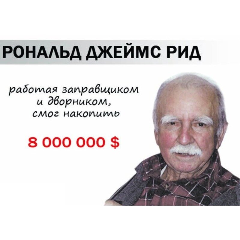 Рональд Рид родился в маленьком американском городке, жил скромно и работал на заправке. Однако у него был большой секрет — сумма, которую он заработал на акциях. Рассказываем историю успешного работяги. Для достижения успеха на фондовом рынке и заработать миллионы, необязательно иметь большой капитал. Это было доказано на примере Рональда Рида. Он был первым в семье, кто получил среднее образование. Работал уборщиком, заправлял машины на АЗС, был подсобным рабочим в магазине. В 1940 году Рональд закончил школу и поступил на работу в Братлборо. На протяжении всего периода Второй мировой войны он служил в Северной Африке, Италии и на Тихоокеанском театре боевых действий. По возвращении домой он переехал в Братлборо и устроился на заправку, где проработал 25 лет. Он женился на женщине, у которой было двое детей. После окончания работы на АЗС Рональд вышел на пенсию. Через некоторое время он понял, что это его не устраивает, и решил пойти работать в магазин. Знакомые Рида описывали его ка