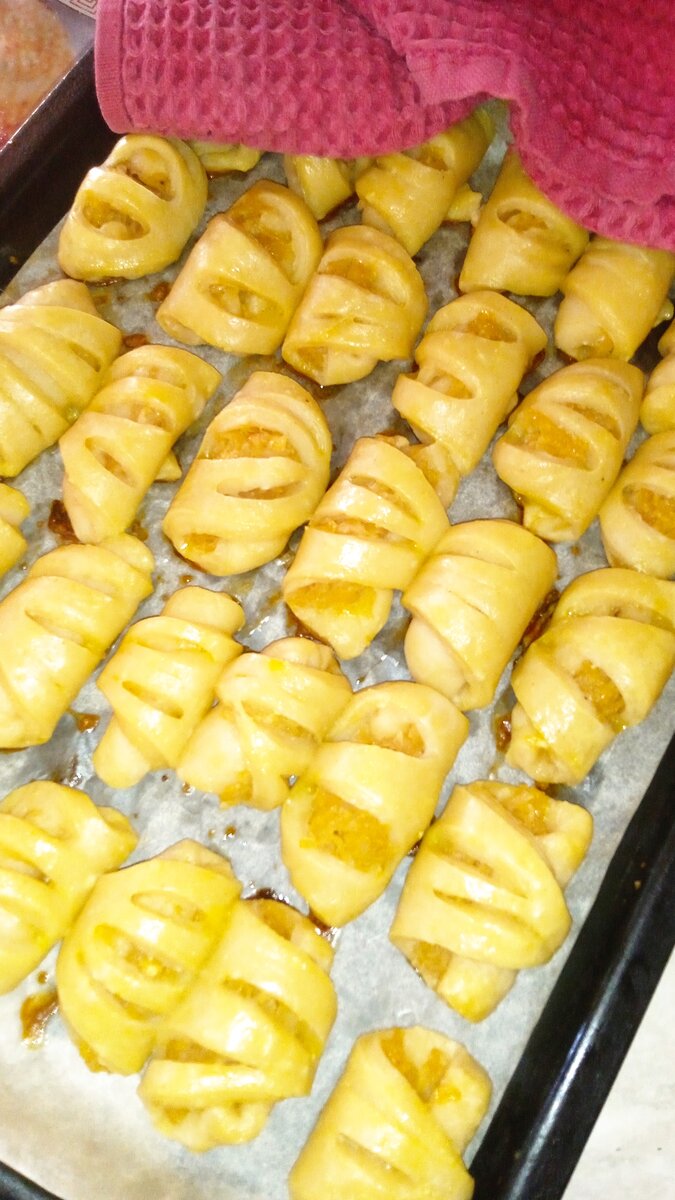 Рецепт не мой😊, подсмотрела в интернете😌. И они реально вкусные. 🤗🤗🤗🤗 Поехали. Творог 200 гр. Яйцо одно. Сахар, две столовые ложки, полные с горкой. Соль. Сливочное масло, грамм 150. Масло растопить. Добавить к творогу. Налить пол стакана тёплого молока. Муки мне понадобилось, почти 18 столовых ложек, с горкой, может и больше, я подсыпала и месила, пока тесто не перестало липнуть к рукам. 😊 Разделила на четыре части. Начинка. Два яблока сладких, натереть на крупной терке. Цедра лимона. Соединить. Сливочное масло растопить. В яблоки всыпать две столовые ложки сахара. Жарить на сливочном масле пока не уйдёт яблочный сок. Раскатать один кусок теста, разрезать сперва на четыре части, а потом эти четыре части, тоже поделить. И сделать сверху, по два, по три пореза, не до конца. Выкладываем начинку, и заворачиваем. Смазываем рогалики размешанным яйцом, и отправляем в хорошо разогретую духовку. Духовку убавляем, на слегка средний огонь. Рогалики с яблоками и