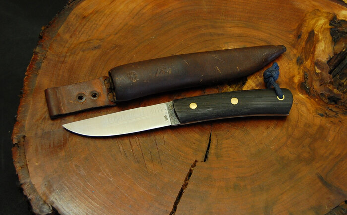 Здравствуйте Меня все так же зовут Владислав и сегодня будет нож одного из работников нашей мастерской - Павла Александровича. Фото и описание выкладываю с его разрешения. Наш мастер работает в стиле ножей северных народов, саамов, якутов, эвенков и скандинавов. Это его личный нож, который он носит на кармане как EDC - Every Day Carry - "ношу каждый день" Нож сделан из нержавеющей стали Н690 конструкцией фултанг, 2, 5 мм толщиной. Мореный дуб на рукояти. Латунный пруток 6 мм в качестве пинов и латунная трубочка в качестве отверстия под темляк. Ножны погружные, в скандинавском стиле, из кожи растительного дубления с глубокой пропиткой натуральным воском. С одной стороны на лезвии гравировка TEMERE NEC TIMIDE - "Не оскорбляй и не бойся" в руническом стиле и клеймо мастера. С другой стороны драккар - боевой корабль викингов. Нож очень универсальный, небольшого размера, простой формы и очень удобными ножнами. Идеален для небольшого похода в лес или на шашлыки. Мореный дуб выглядит отлично.