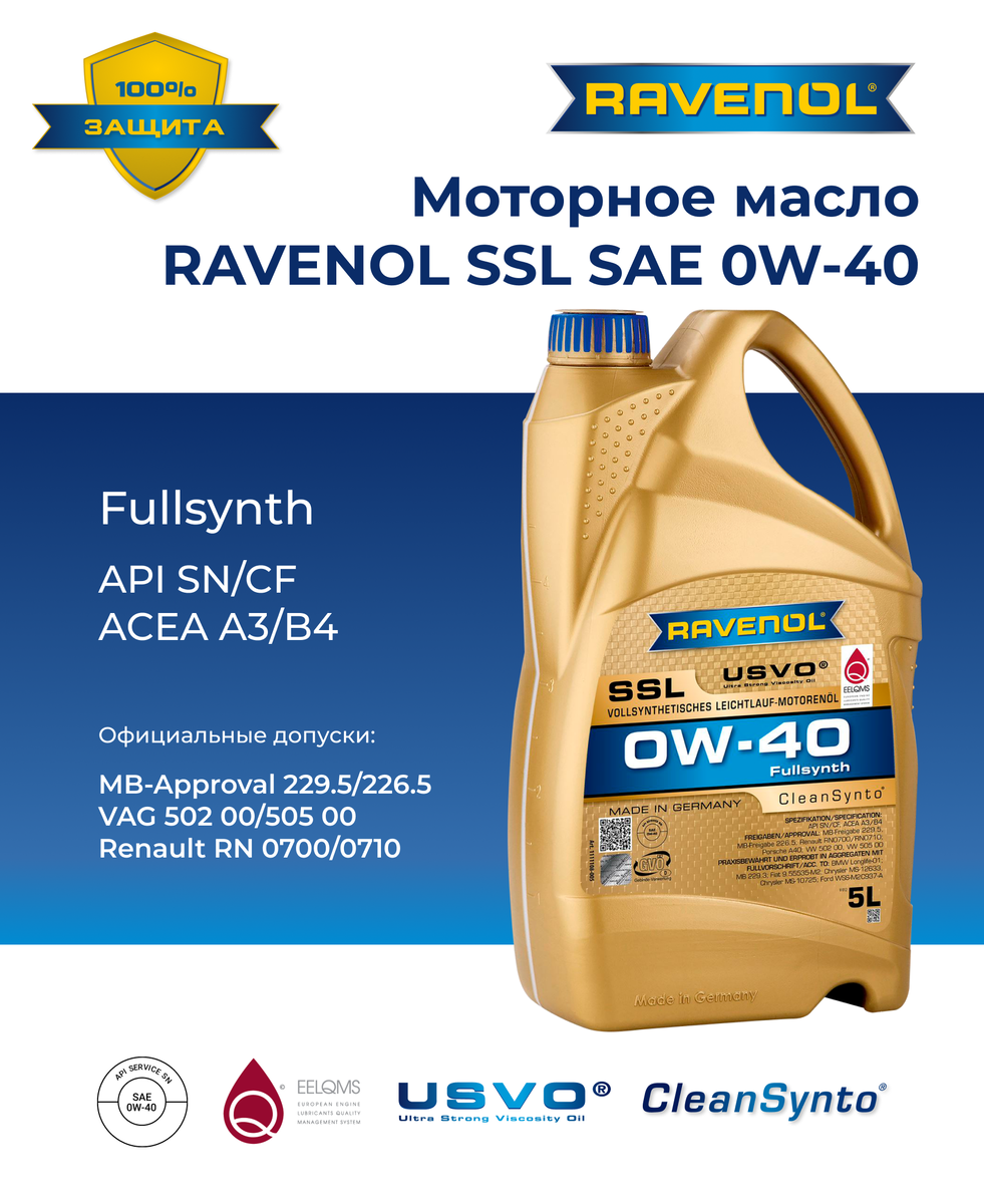 В настоящее время актуален вопрос поиска качественных масел с официальными допусками производителей. Масла RAVENOL закрывают все потребности покупателей по официальным допусками европейских, американских и азиатских производителей. Моторное масло RAVENOL Super Synthetik Oel SSL 0W-40 Лицензия API: SN/CF