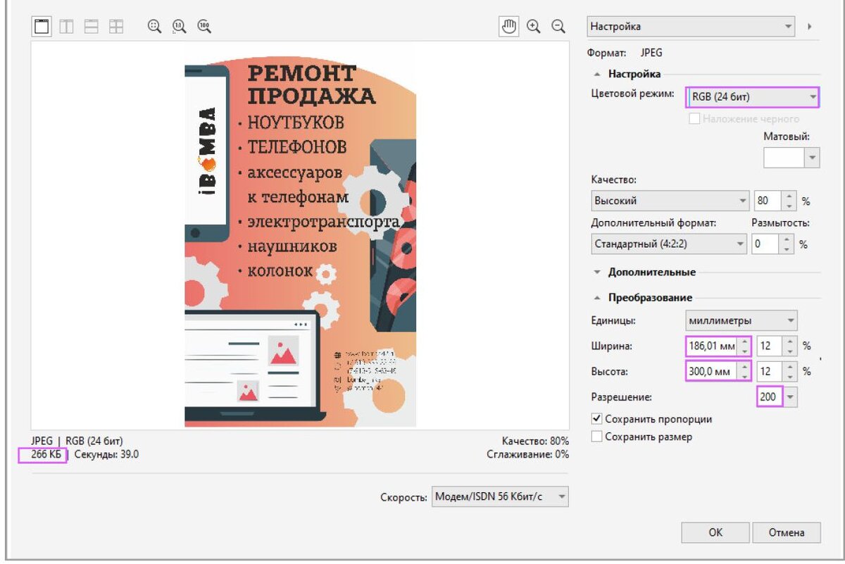 Оптимальные настройки экспорта в JPG вариантов дизайна из CorelDraw для заказчика.