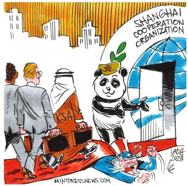 Левый бразильский художник Карлос Латуфф комментирует рисунком новость: Саудовская Аравия приняла приглашение Пекина вступить в Шанхайскую организацию сотрудничества. Это позволит королевству снизить свою зависимость от США.