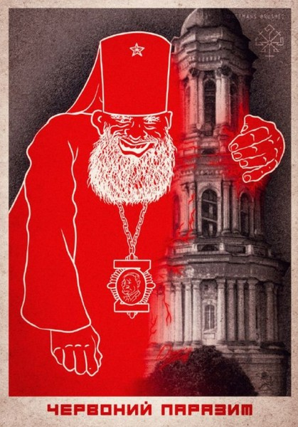 Сколько князья церкви РПЦ ни трудились, 30 лет проклиная безбожных большевиков, но бандеровцы всё равно изображают их в красной рясе и с красной пятиконечной звездой на лбу. Так стоило ли стараться?..