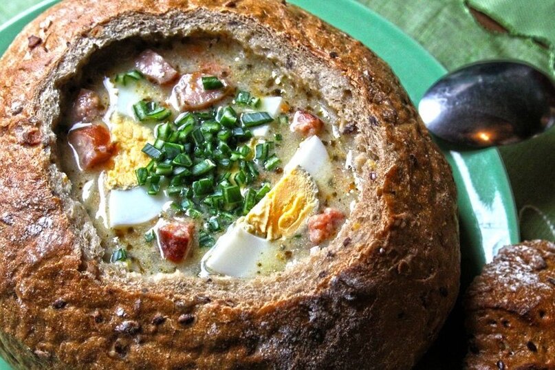 Традиционный польский суп. Вариация на тему «похмельного супа»))). В основе его идёт раствор ржаной муки, заквашенный на ржаных корках. Добавляют сметану, хрен, варёное яйцо, всевозможные копчёности.