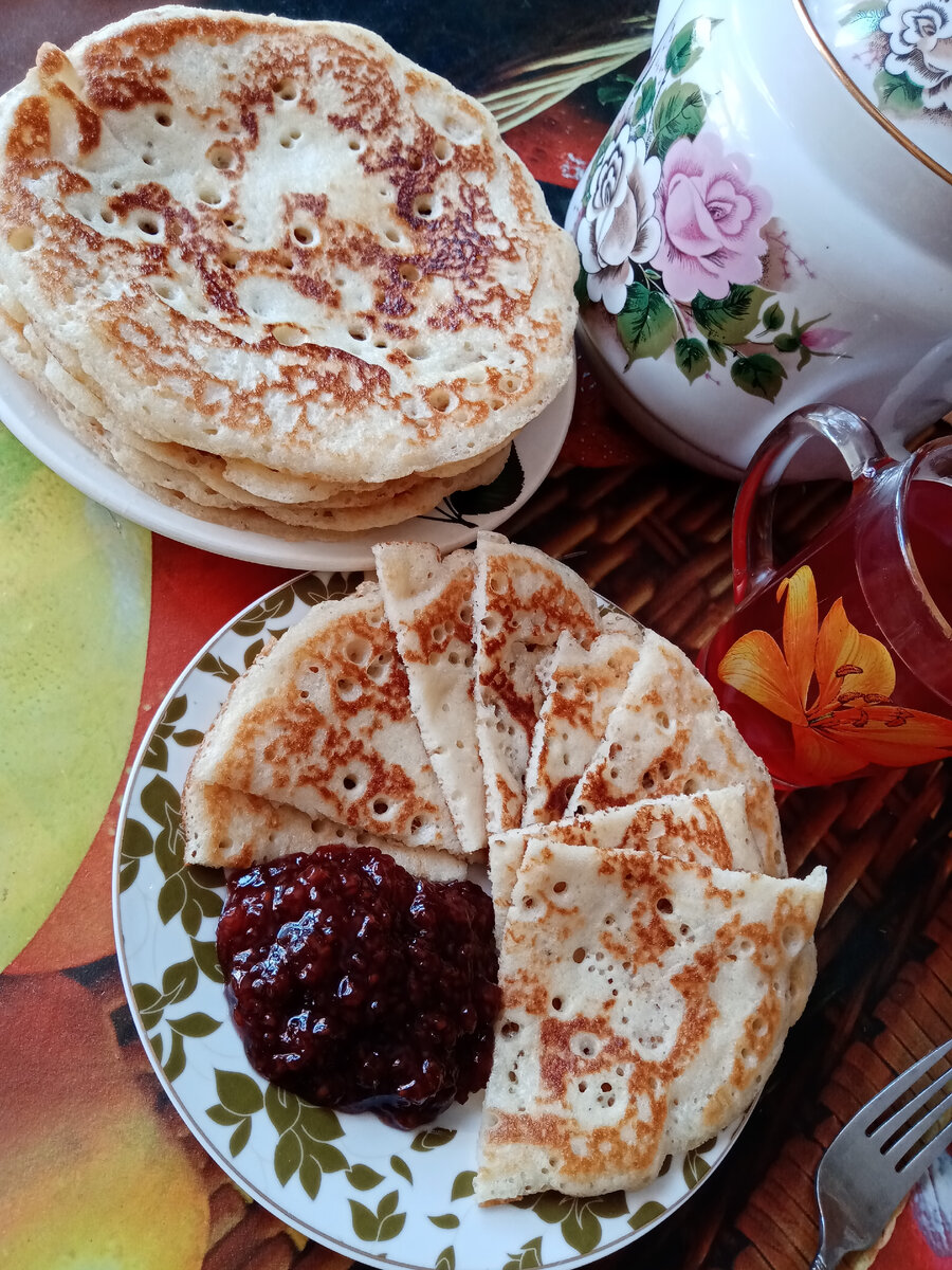 Всем заглянувшим ко мне на огонёк доброго времени суток! Сегодня жарила блинчики, в основе которых была манная крупа, получились очень вкусные)) Краткий рецепт: в стакан кефира добавить стакан кипятка, 3 ст.л. сахара, немного соли, 10 гр. живых дрожжей, 150 гр. манки и 100 гр. муки, всё хорошо перемешать и поставить тесто подходить на 1 час. Затем жарить на подсолнечном масле. Ещё сегодня делала окрошку, рецептов окрошки много, делаем мы её по разному, а сегодня у меня окрошка "По-жарковски" - с килькой в томатном соусе)) Рецепт: зелёный лук, яйца, свежий огурец и банка кильки, всё заливаем домашним квасом и добавляем сметаны. И как всегда меню на неделю с 10.04.2023 - 16.04.2023 Понедельник: завтрак - блинчики на кефире со сметаной, чай/кофе; обед - суп картофельный с тефтелями; винегрет; ужин - пельмени; винегрет Вторник: завтрак - бутерброды; манник с черной смородиной (ягоды из заморозки) обед - тот же;