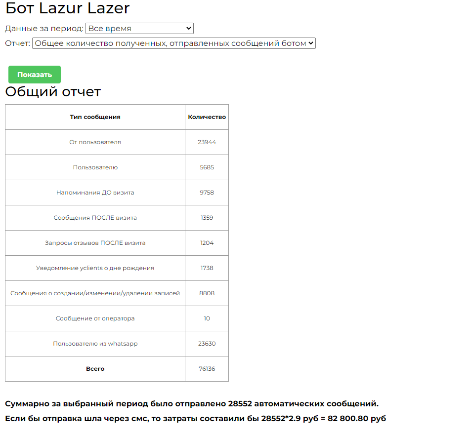 Бот сэкономил 82 800 рублей на СМС уведомлениях.