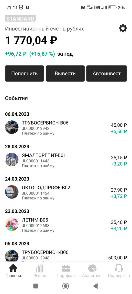 Сразу скажу, что здесь всё находится только в зачатке. Деньги инвестированы небольшие, поэтому говорить об этом как о полноценном источнике дохода пока не приходится. Наверно, уже многие слышали о такой платформе как Jetland, именно через неё я делаю свои первые шаги в этом направлении. Скажу честно, сама идея мне не очень понятна с точки зрения рациональности таких кредитов для заемщиков, брать займы под такие проценты как минимум не выгодно, ну и второй момент, кто берёт такие займы, скорее всего эмитенты которые испытывают трудности с оформлением кредита в обычном банке. Таким образом, общее впечатление у меня пока отрицательное. Но, теперь давайте к моему личному опыту. Как я уже сказал сумма проинвестирована небольшая, но результат, как не странно, положительный. Как вы видите доходность за год составляет порядка 16%, что на мой взгляд очень неплохо. У меня стоит авто инвестирование и стратегия выбрана сбалансированная, что подразумевает доходность от 13 до 20%, как вы видите у м