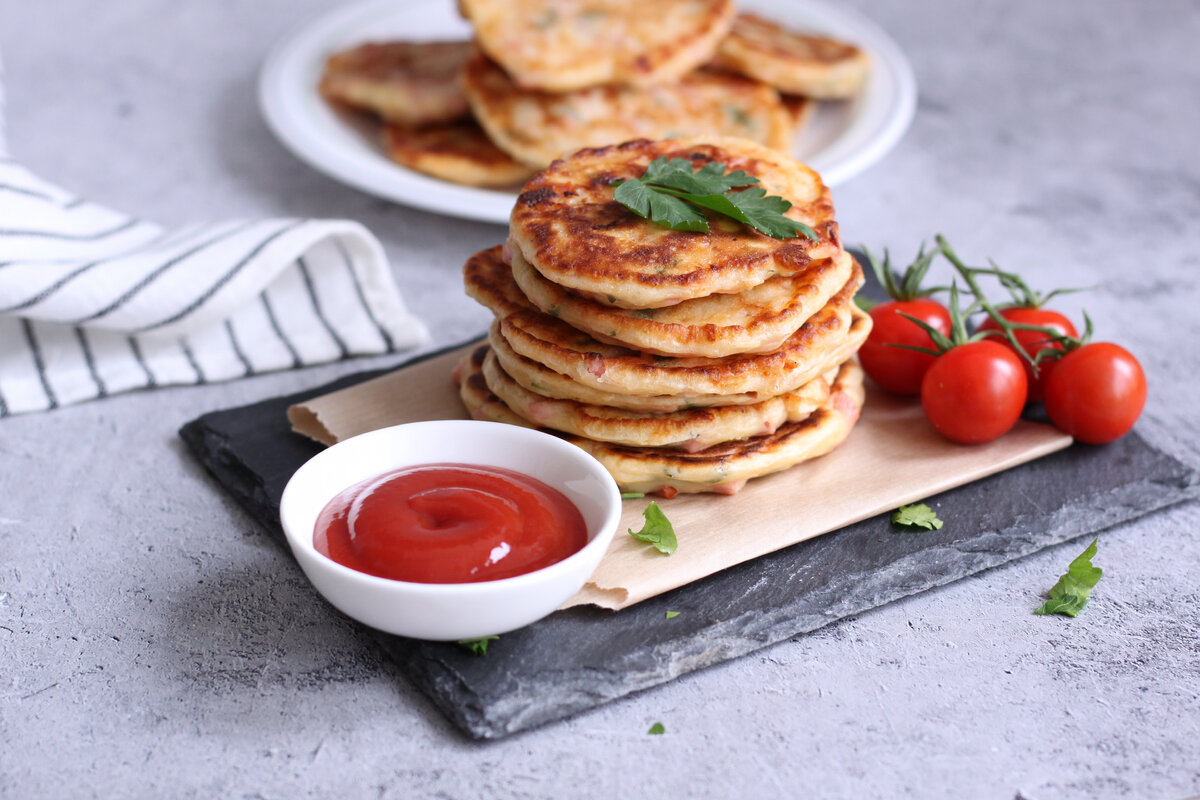 Когда хочется разнообразить завтрак, готовлю такие оладьи. С начинкой можно экспериментировать: добавлять ветчину, адыгейский сыр, томаты, различные специи и проч. Сыр натереть, ветчину и помидор нарезать мелкими кубиками, зелень мелко нарубить. Выложить в миску и перемешать. Добавить в миску яйца, кефир, сметану. Посолить по вкусу. Муку смешать с разрыхлителем, просеять в миску к остальным ингредиентам. Хорошо перемешать. Обжарить на растительном масле под крышкой с двух сторон. Ингредиенты: 350 мл кефира