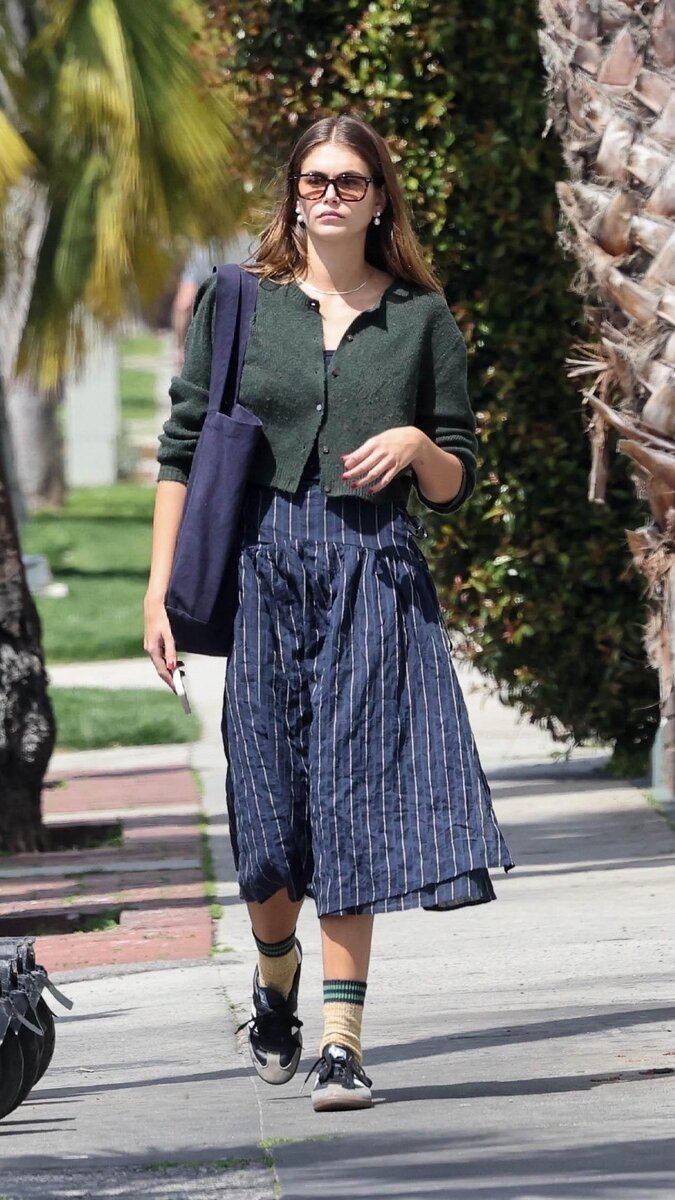 В последнее время Кайя Гербер уверенно сменяет широкие брюки на платья и юбки. На шопинг модель отправилась в винтажном аутфите, надев синий сарафан в белую полоску и укороченный темно-зеленый кардиган. Выход она дополнила кедами, высокими цветными носками и сумкой-шоппером. Завершили женственный образ солнцезащитные очки, жемчужные серьги и лаконичное колье. Читайте также на нашем сайте: Подписывайтесь на нас в Телеграме, чтобы быть в курсе последних новостей!