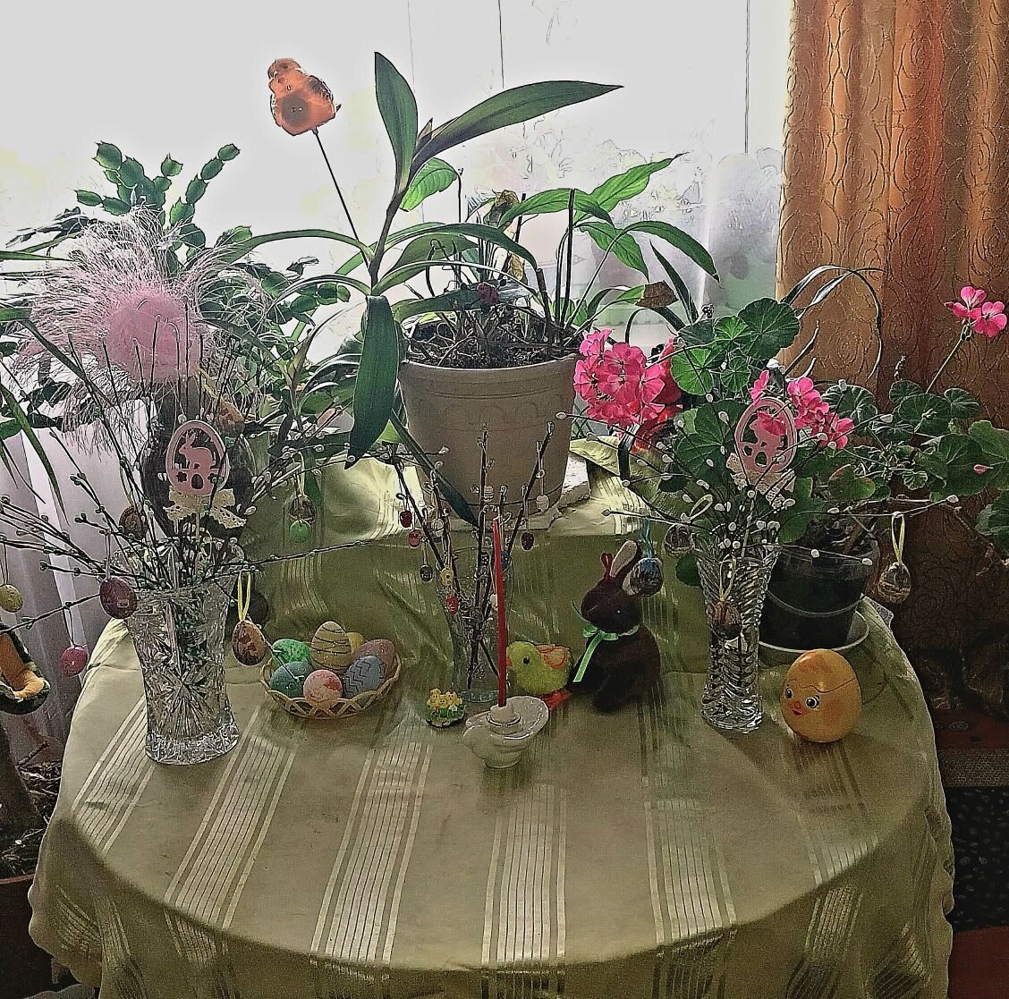 Утро, девятого апреля, началось очень рано, разбудили меня сначала громкие песнопения, а потом к ним присоединился звон колоколов. Сразу стало понятно сегодня праздник. Вот мы и дожили до Вербного воскресения. Поздравляю всех с праздником, от всего сердца желаю хорошего настроения, с ним легче пережить всё. После завтрака мы пошли оформлять Пасхальную композицию, у нас уже сложилась традиция, каждый год оформляем Пасхальный натюрморт. После я сделала Маме чашку кофе и оставила её смотреть телевизор, сама же пошла заниматься финансовыми делами, надо было оплатить счета и кредит. Затем зашла к соседке, отнести посуду, от вкусняшек, которыми она угощала раньше, чуть-чуть поболтали и я вернулась домой с новой порцией угощения. Когда я завершила дела насущные, Мама как раз отдохнула, так что время было собираться на прогулку, совместить приятное с полезным. Таги, естественно, отправилась с нами. Покормив птичек, через сквер, мы пошли купить хлеба, который без упаковки, когда свежий он очень