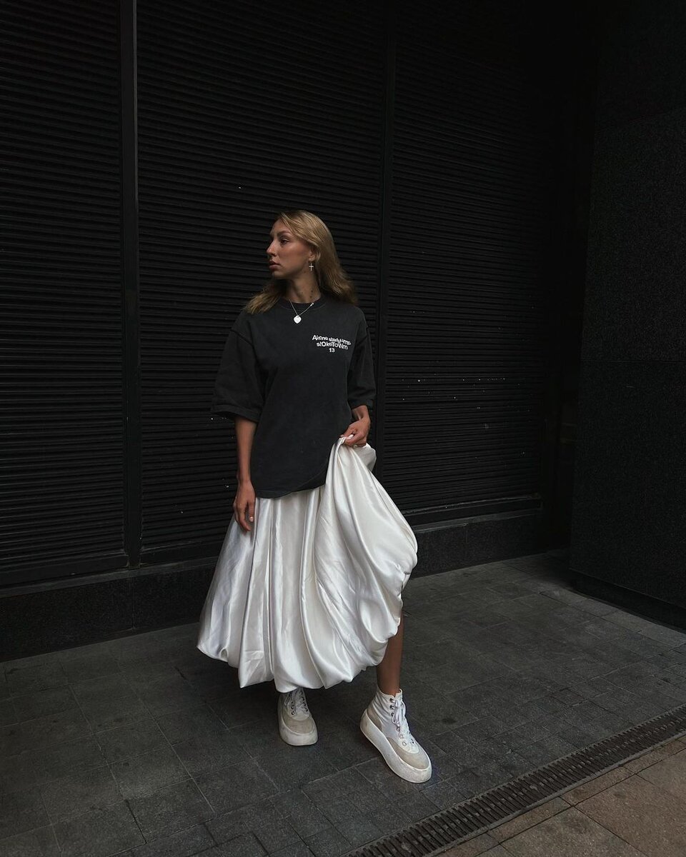 Если вы активно следите за модными инфлюенсерами, то не могли не заметить, как в их гардеробе появились собранные снизу юбки длины макси и мини. Это и есть юбки баллон. Посмотрим, с чем их можно носить? 1. С оверсайз футболкой На первый взгляд может показаться, что юбка баллон - не тот элемент, с которым получится составить повседневный образ. Но первое впечатление часто бывает обманчивым. Добавьте к юбке баллон оверсайз футболку (особенно хорошо будут смотреться винтажные и вываренные), кеды и простую сумку. Образ на каждый день готов. 2. Со свитшотом Еще один способ нейтрализовать яркость и праздничность юбки баллон - сочетать ее со свитшотами и худи. 3. С укороченным кардиганом Если последние несколько лет вы следили за трендами, то, скорее всего, не устояли от покупки укороченного кардигана. Чтобы вдохнуть в этот элемент вторую жизнь, выберите юбку баллон в качестве низа. 4. С кожаной курткой Смешение стилей - сложный стилистический прием. Однако правильно выполненный, он сдела