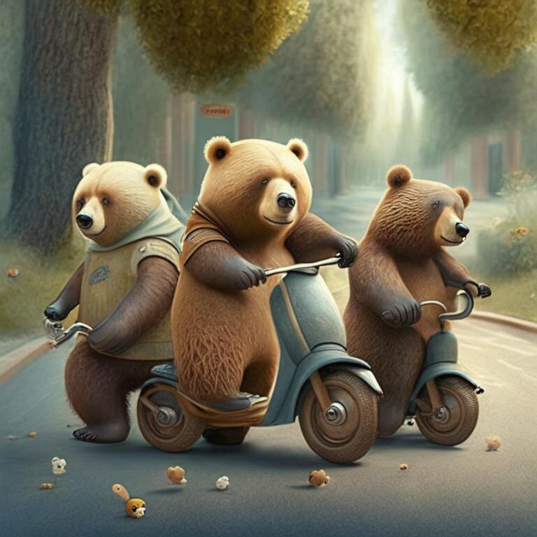 Жили-были три медведя - папа, мама и маленький мишутка. Они жили в глубине леса и очень любили прогуливаться по его тропинкам. Однажды, гуляя по лесу, медведи заметили что-то странное на тропе. Подойдя ближе, они увидели самокат! Маленький медвежонок был очень рад, и начал просить родителей купить ему такой же. Но папа и мама медведи сказали, что это не просто купить, потому что медведи не умеют ездить на самокатах. Вдруг, из-за дерева, выскочил кролик и сел на самокат. Он сразу же понял, как им управлять, и покатился по тропе. Медведи были очень удивлены и заинтересованы. Кролик с улыбкой на морде пригласил их покататься на своем самокате. Папа и мама медведи немного побоялись, но мишутка был очень смелым и решился попробовать. Кролик дал ему свой самокат, и он покатился. Он наслаждался скоростью и ветерком, который дул ему в уши. Потом папа и мама медведи тоже решили попробовать, и им очень понравилось! Они покатались вдоль тропы, наслаждаясь прекрасной погодой и свежим воздухом. Ко