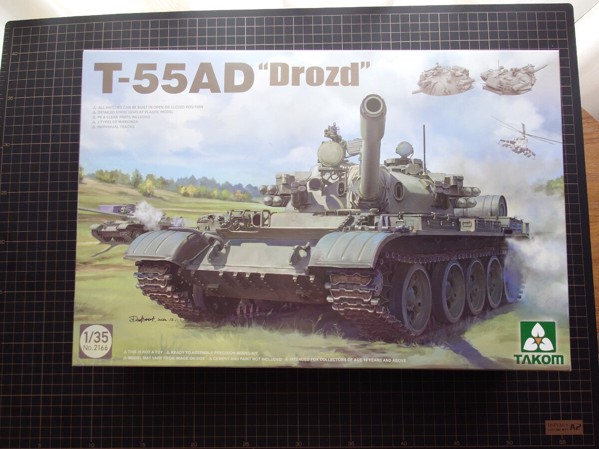 Всем привет, посмотрим на еще одну новинку от Takom'a за артикулом №2166 Т-55АД "Дрозд" Коробка стандартных размеров с красочным боксартом. Пластик стандартный для Такома, серый, литье очень хорошее. Литник А это ходовая, катки без бандажей (они отлиты отдельно), крышки ступиц отдельно, на катках пролиты даже подшипники! Литник В это бандажи, пролиты отлично, красить удобно! Второй литник В (да, Таком скоро превратится в Дрэгон, где из-за унификации в одной коробке куча разных литников с одним наименованием) содержит элементы КАЗ "Дрозд" дымовые гранатометы (пролиты отлично) и разные мелочи. Литник С содержит внешние топливные баки (из двух половин, увы) коуши тросов, короба для пулеметных лент. Литник Е это бревно (пролито отлично) и части надгусеничных полок. На литнике Н находится нижняя часть башни, люки, ствол спаренного пулемета (увы без отверстия) и ствол орудия (из двух половин, что печально). Литник J это надмоторная плита, погон башни, баки. Литник J2 это еще одна нижняя ча