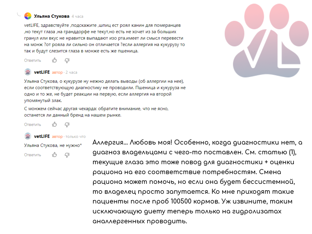 И снова начинаем неделю с интересных вопросов недели... Они отчасти отображают то, что у меня обычно можно встретить в комментариях. Ответы могут быть полезны всем. Приветствую читателей канала vetLIFE! Желаю всем продуктивной и удачной недели. Статьи по упомянутым темам: 1) Схема диагностики питомца с зудом и т.п. без которой нельзя представить постановку диагноза "аллергия"! 2) О том, что идеального корма во всеобъемлющем смысле не бывает. И как их в таких условиях сравнивать? И не забываем, что доп. информацию с последней лекции Коняева выложу на своём тг-канале. Есть ли у Вас вопросы, заслуживающие подробного упоминания в данной рубрике? Или комментарии к уже упомянутым вопросам?