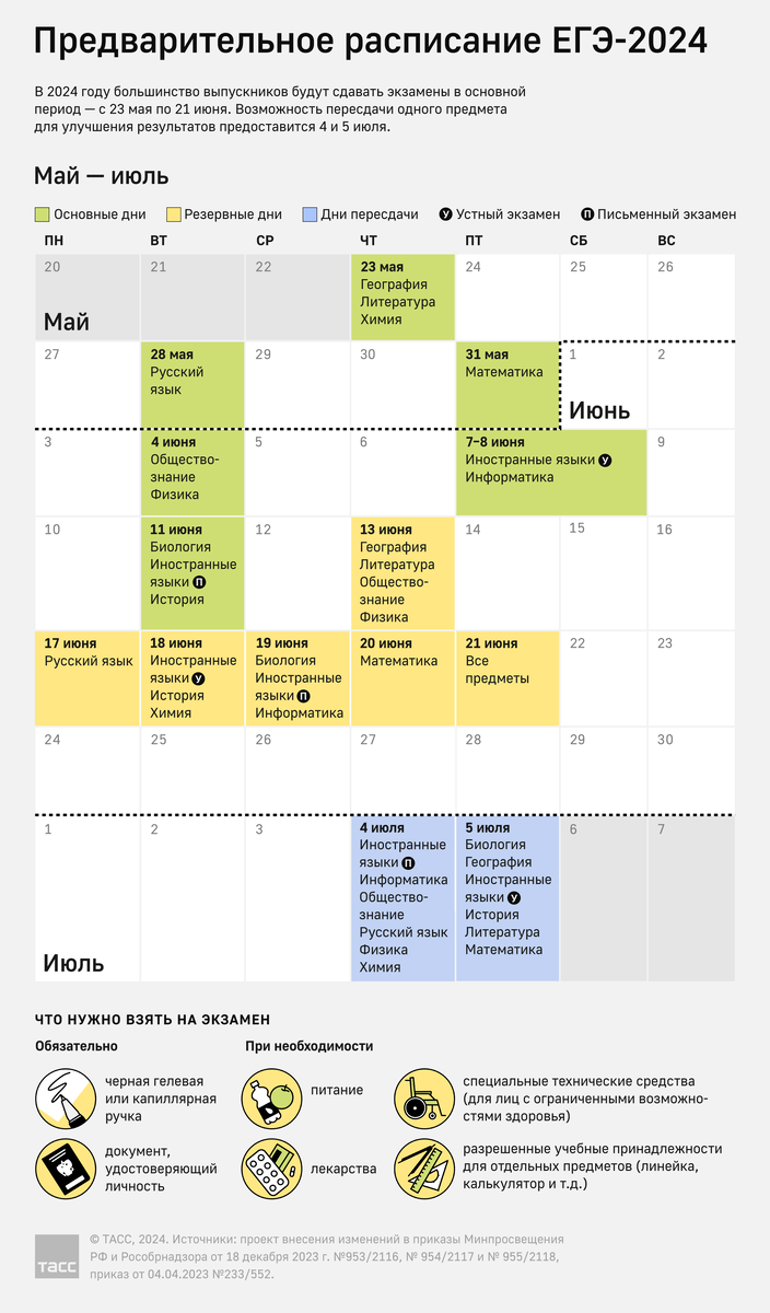 4 апреля Минпросвещения РФ и Рособрнадзор опубликовали проект приказа расписания ЕГЭ-2024. Согласно новому порядку, выпускникам предоставится возможность пересдать один предмет до конца приемной кампании. В этом случае первый результат экзамена будет аннулирован. Дни пересдачи предлагается назначить на 4 и 5 июля. В связи с новым порядком также изменилось расписание основного периода ЕГЭ для некоторых предметов. Так, экзамен по физике предлагается перенести с 10 июня на 4 июня. Устную часть ЕГЭ по иностранным языкам, прежде назначенную на 17 и 18 июня, могут провести 7 и 8 июня. Биологию, письменную часть по иностранным языкам и историю предлагается сдавать 11 июня. В случае принятия изменений основной период сдачи ЕГЭ состоится с 23 мая по 21 июня. Он, в свою очередь, делится на основные и резервные дни. В основные дни — с 23 мая по 11 июня — экзамены сдают большинство выпускников. В резервные дни — с 13 по 21 июня — выпускники смогут пересдать экзамен по уважительной причине или сда