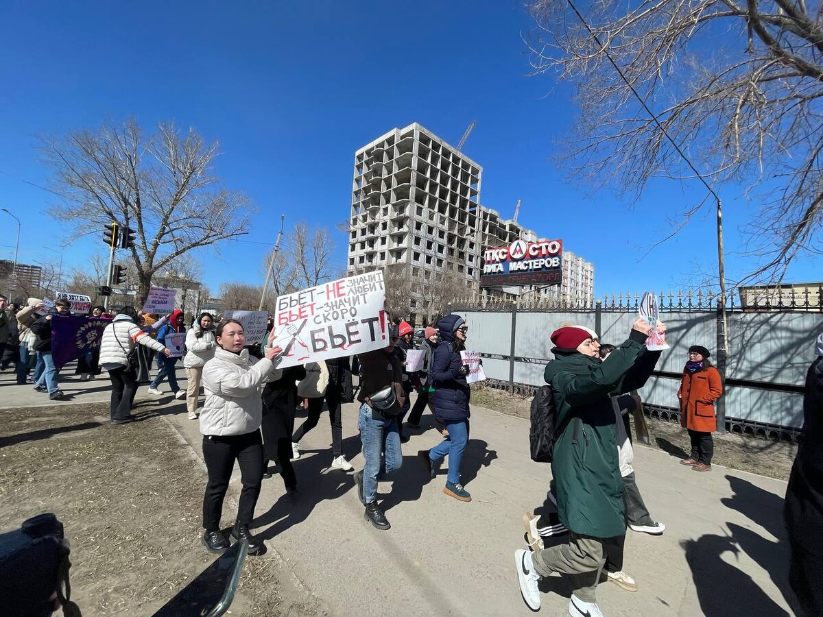 Сотни людей идут по улице Абая и скандируют: «бьет, значит сядет», «без феминизма нет свободы» и «позор акимату», который не перекрыл для них дороги. Полиция обеспечивает правопорядок, вокруг громко, но спокойно. Марш против насилия проходит без насилия. Марширующие пришли в парк по улице Пушкина. Это одно из разрешенных в городе мест для митингов.