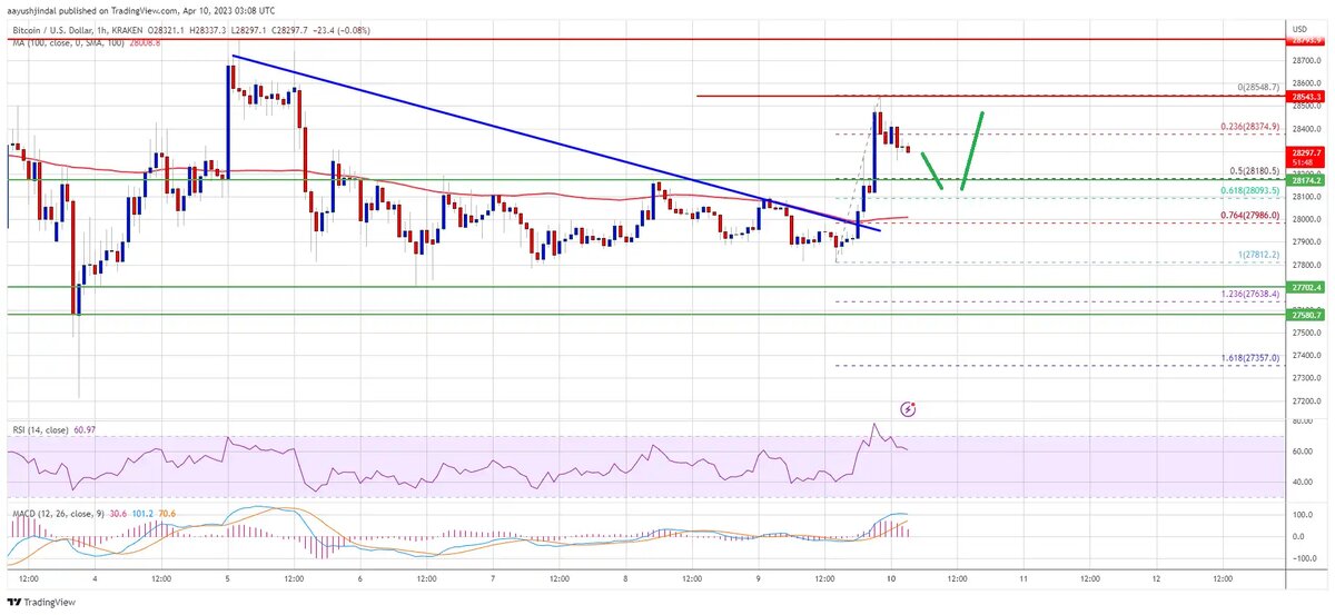 Цена биткойна оставалась выше зоны поддержки в $27 700 долларов. BTC сформировал базу и смог снова подняться выше зоны сопротивления $28 000 Было четкое движение выше зоны сопротивления $28 200 и 100-часовой простой скользящей средней. Кроме того, на часовом графике пары BTC/USD произошел прорыв выше основной линии медвежьего тренда с сопротивлением около $28 000. Пара протестировала зону сопротивления $28 550. Максимум сформировался около $28 548, и сейчас цена корректируется ниже. Произошло движение ниже уровня коррекции Фибоначчи 23,6% восходящего движения от минимума колебания на $27 812 до максимума на $28 548. Тем не менее, цена биткойна сейчас торгуется выше $28 200 и 100-часовой простой скользящей средней . Ближайшее сопротивление находится около уровня $28 450. Следующее серьезное сопротивление находится около зоны $28 550. Закрытие выше уровня сопротивления $28 550 может подтолкнуть цену выше к диапазону сопротивления. Следующее ключевое сопротивление находится около уровня $