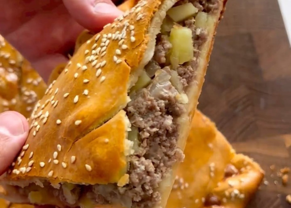 Сегодня предлагаем вам вариант сытного пирога, который легко сможет накормить всю семью. Тонкое тесто и сочная начинка. Это очень вкусно. Выпекать его можно как в форме, так и просто на листе. Итак, понадобится: Тесто Начинка Приготовление 1. Для теста: соединяем кефир, соду, соль и одно яйцо. Перемешиваем. Добавляем муку и сливочное масло. Замешиваем мягкое, нежное тесто, которое не липнет к рукам. Убираем его в пакет и оставляем на пол часа. 2. В это время займёмся начинкой. Для начинки смешиваем фарш, картофель, лук. Добавляем соль, красный и чёрный перец по вкусу. Хорошо перемешиваем. Собираем пирог: Тесто делим на две части, каждую раскатываем. Одну часть теста перекладываем на противень. Распределяем сверху начинку, добавляем кусочки сливочного масла. Накрываем второй половиной теста и залепляем края. Сверху пирог смазываем яйцом и посыпаем кунжутом. Отправляем запекаться в разогретую до 180С духовку приблизительно на 1 час. Вы только посмотрите, какой красивый и вкусный получает