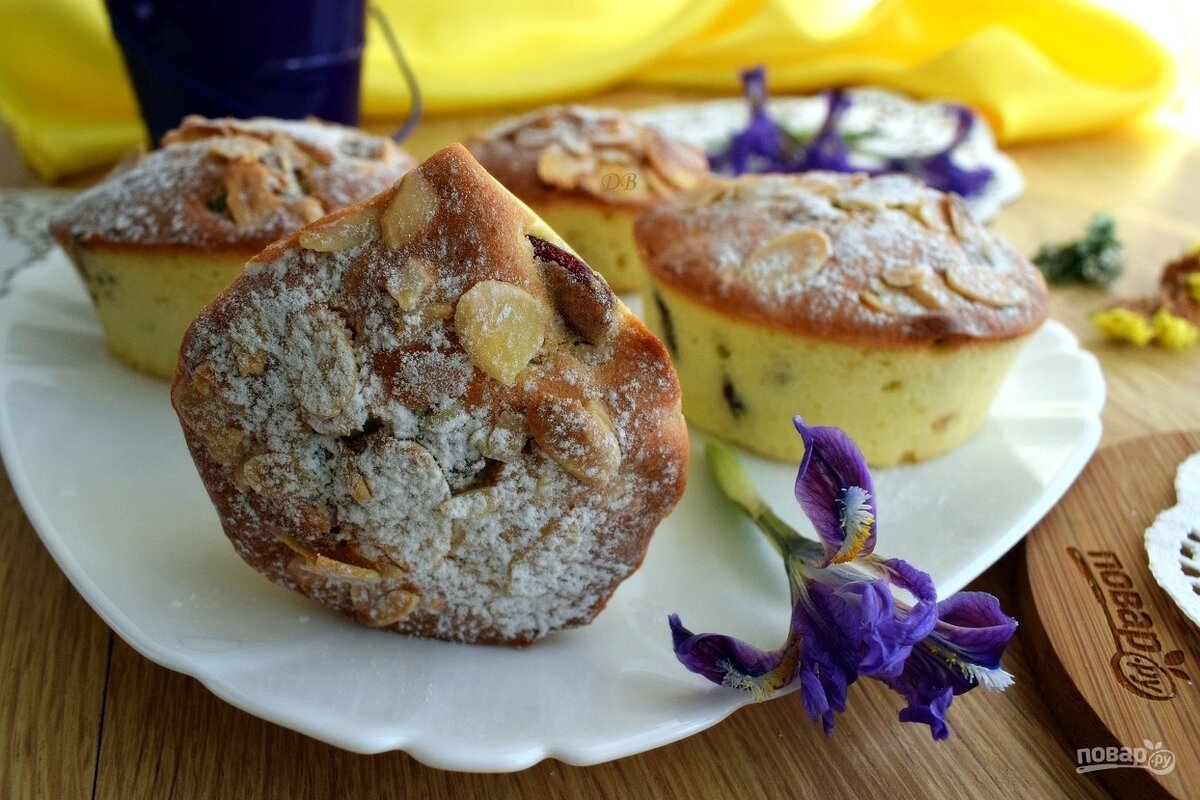 Разложите тесто по силиконовым формам, заполняя их на 2/3 от всего объема. Сверху посыпьте миндальными лепестками.