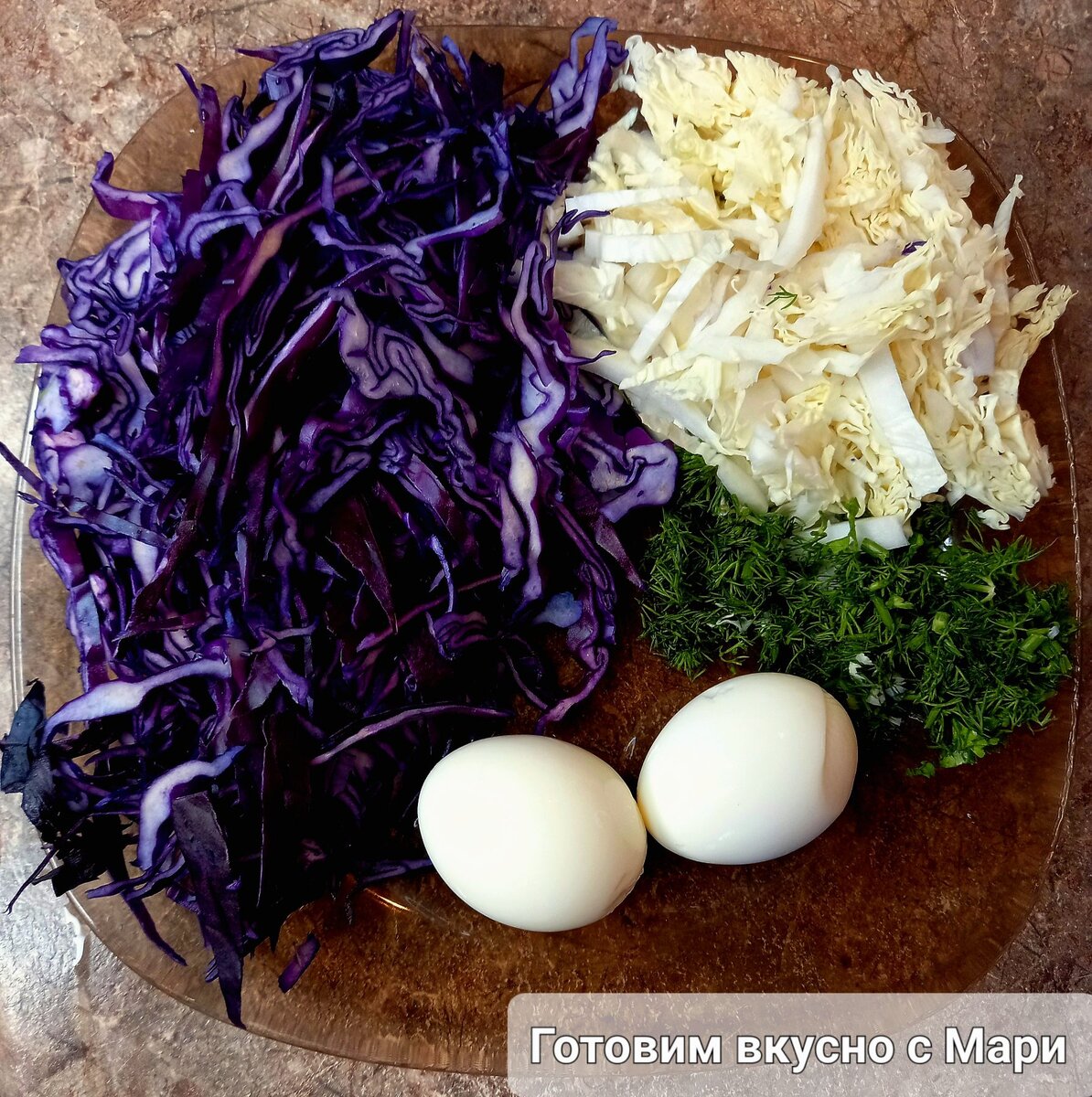 Капусту фиолетовую и пекинскую хорошо промываем, обсушиваем и мелко шинкуем.