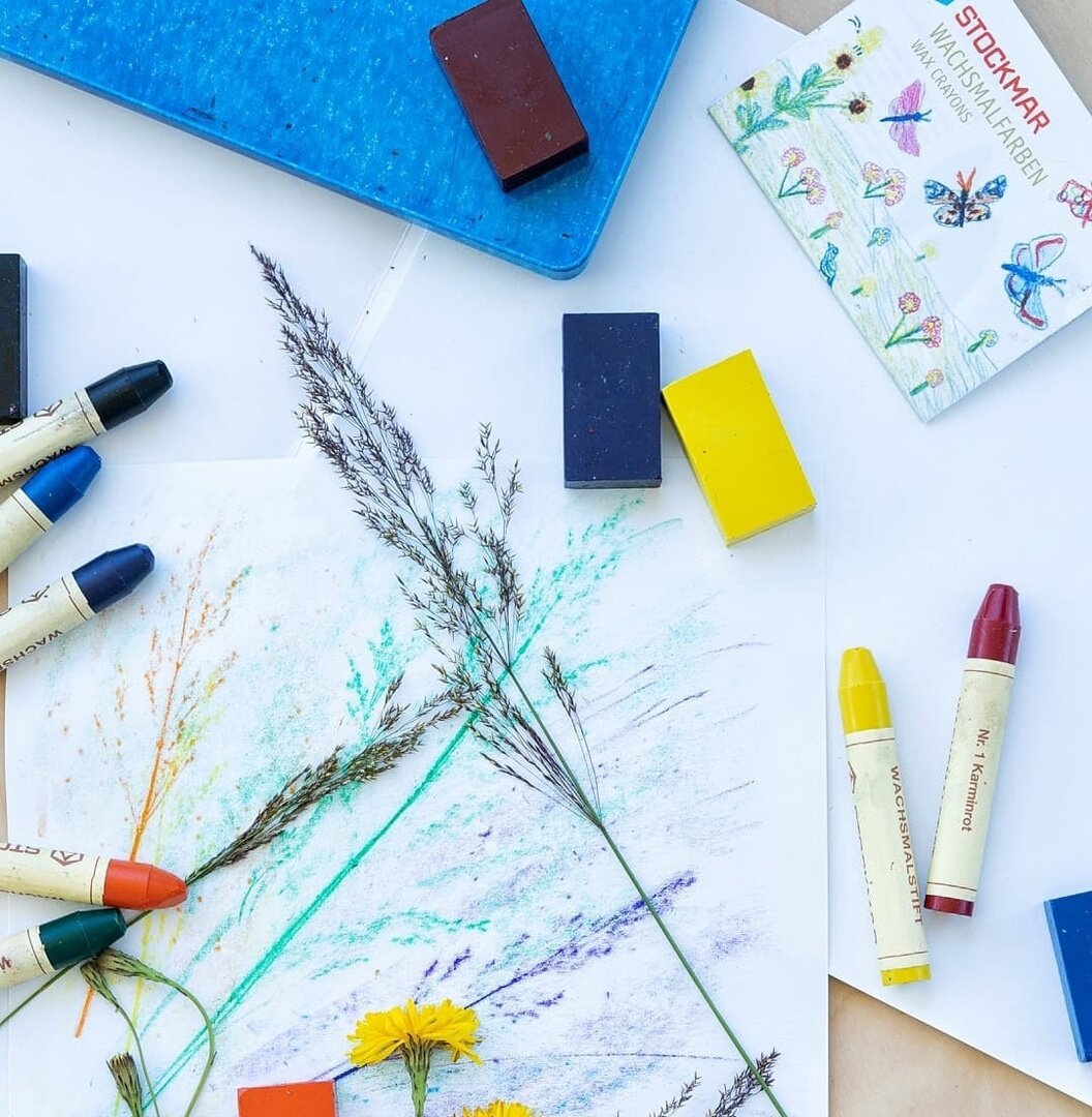В вальдорфской педагогике рисуют натуральными восковыми мелками «Stockmar», которые изготовлены из пчелиного воска с добавлением растительных красителей. Они пахнут медом. Маленькие дети, только начинающие рисовать, с удовольствием берут их в руки, нюхают, даже пробуют на зуб. Это и безопасно, и приятно.