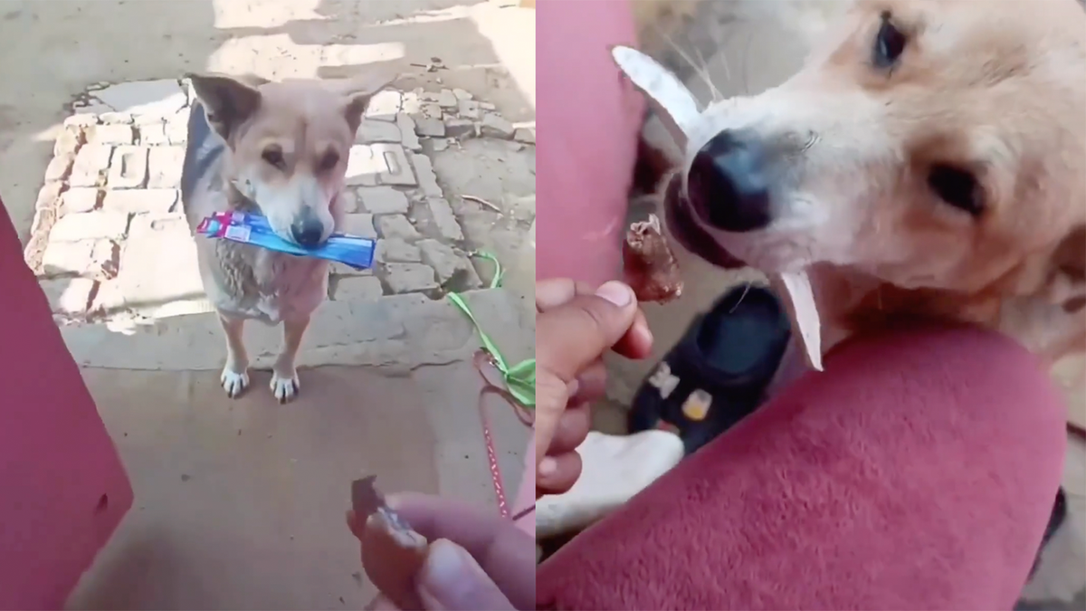 Собака приносит людям листья и бумагу, чтобы «купить» лакомства