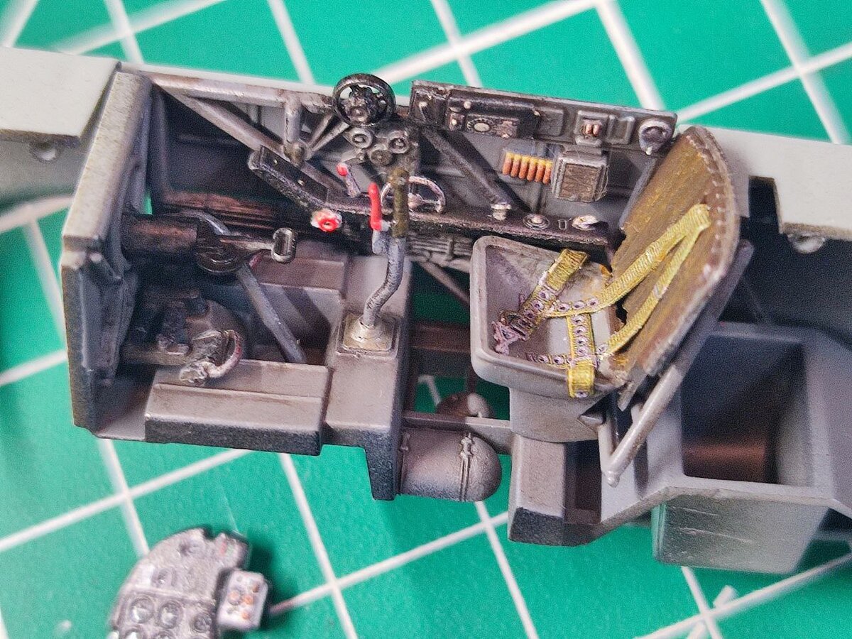 Подготовительные работы к покраске почти окончены. Собрал и покрасил кокпит , красил Аканом А-14 стальной серый, высветлял Ганзой С-13. Использовал набор 3Д декалей от Квинты. . Далее собрал половинки, зашпаклевал в несколько этапов, зашкурил и восстановил расшивку и клепку. . Сточил кок винта и стенки "ковша" воздухозаборника. Вклеил рацию+проводку к ней, изготовил фару и вклеил. Так же вклеил законцовки крыла с БАНО, родное БАНО отрезал и просверлил дырки под тянутый прозрачный литник. . Заказал вакуфонарь , и цвета основного камуфляжа , их подсмотрел в инструкции Эдуарда на такой же перепак от Accurate Miniatures.