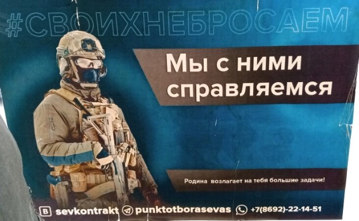 Не мог пройти мимо. Очень показательный постер, наглядно демонстрирующий, почему военным нельзя доверять никакое серьёзное дело. Агиткомпания делалась гражданскими специалистами, а утверждалась каким-то тупорезом переодетым в полковника, который так же ничего не понимает в дизайне, как и во всем остальном, чем занимается. Поэтому на добротном постере вышло "Своих не бросаем, мы с ними справляемся". Впрочем, возможно имелись ввиду укропы, в смысле братья-славяне, свои, которых мы не бросим, а справимся с ними. Если таков посыл, то мое почтение.