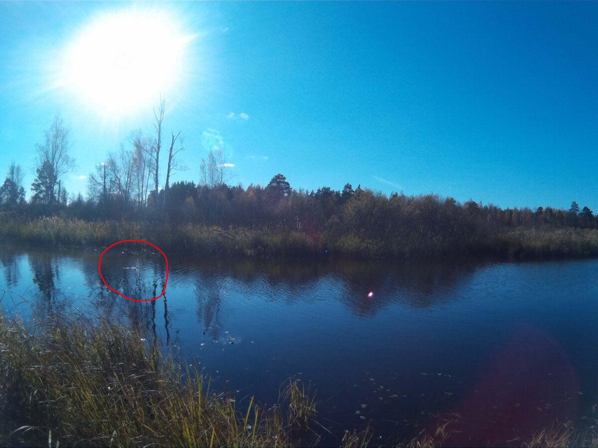 Здесь покажу две фотографии, снятые фотоаппаратом в режиме интервальной съемки. Рядом с фотоаппаратом в это время ни кого не было. Поэтому, что там на самом деле плескалось в воде сказать трудно. Октябрь 2022 года. Место тоже. Вот первая фотография. Здесь явно видно как что-то плещется в воде. Это не похоже на то как плещется рыбка или водная живность, потому что на следующем кадре круги на поверхности воды есть, но очень слабо выражены, при таком-то движении над водой. И при этом видно как под поверхностью воды находится что-то непонятное. Дальше фотографии, для большей убедительности, с выделенными «моментами», которые нас интересуют. Что это такое непонятно. Это не «глюк» фотоаппарата и не какая-то водная растительность, потому что на следующем снимке, через 5 сек., «этого» уже нет. Напоминает трехглавую змею. Чем не змей Горыныч в «детстве» в водном «исполнении» или медуза Горгона. Насколько нам известно, мутанты из мира фауны никогда здесь не встречались. Единственное что, ле
