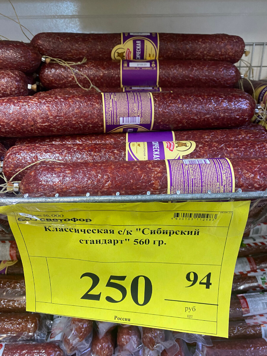 Всем привет! Прошлая поездка в Светофор получилась настолько удачной, что я решила сегодня съездить еще раз. Сегодня кое-что мне тоже пришлось по душе, но не обошлось и без разочарований. Приступим к показу) Колбаса Классическая с/к . Сибирский стандарт. 250.94 рубля за 560 грамм. Эту колбасу вам показывала в свою прошлую поездку среди своих покупок. Может, кто-то обратил внимание. Сегодня тоже ее купили, мама попросила. Очень уж аппетитно выглядит колбаса. В общем, килограмм колбасы по цене выходит меньше 500 рублей. Холодильник сегодня на самом деле был не богат колбасными изделиями. Иногда полки ломятся, а сегодня прям пустовато было. Но, обратила внимание еще на одну колбасу. Колбаса с/к «Фирменная». Вишневый дым, без мяса птицы. Дубки. 315.90 рублей за кг. Этикетка приманивающая и ценник. Без мяса птицы, ничего себе! Цена за с/к безумно дешевая. Сама по себе колбаса темная, не могу сказать, что мне ее купить захотелось. Состав тоже. Хотя в нем нет мяса птицы и механической обва