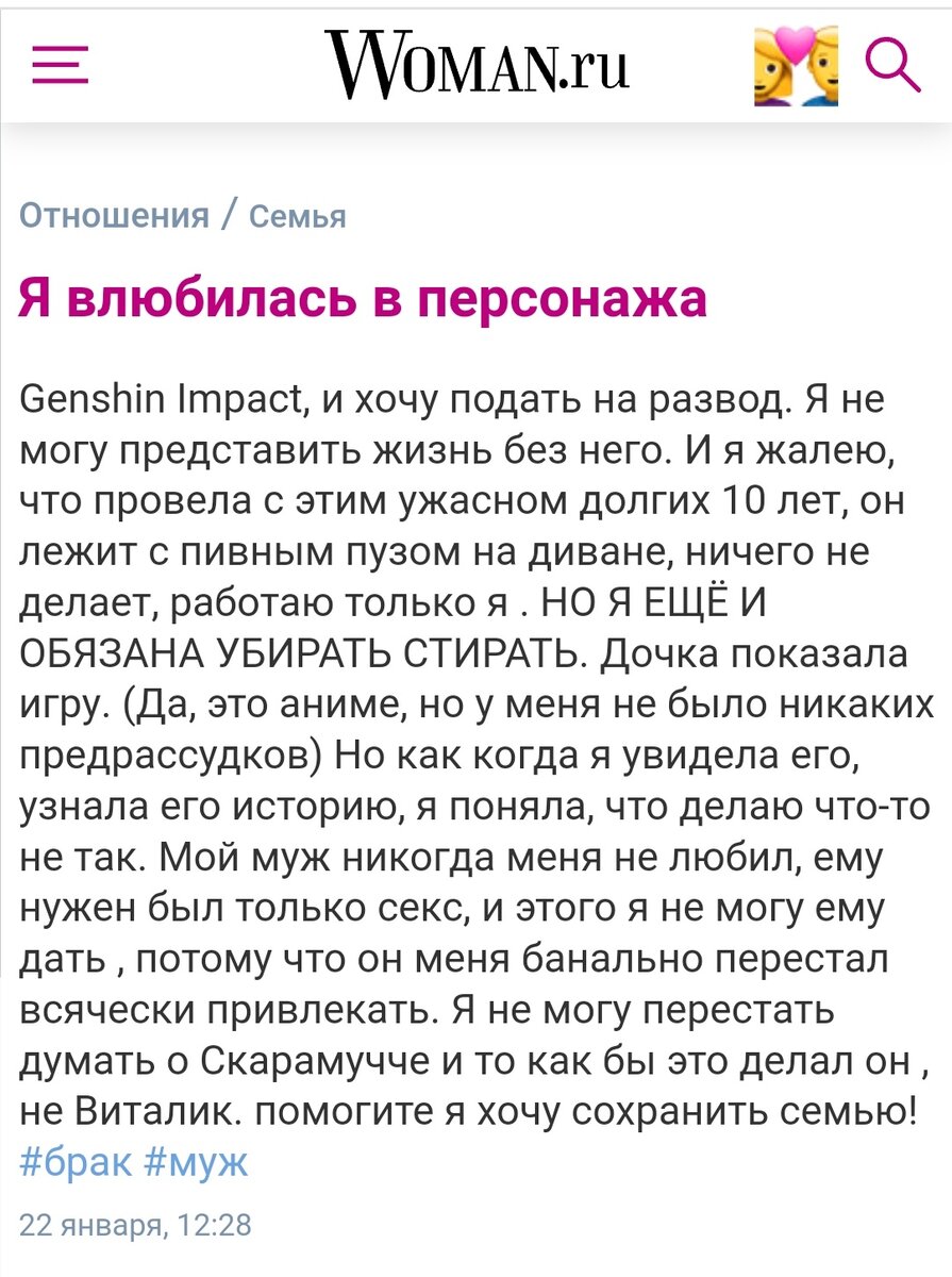 По соцсетям гуляет скриншот поста с форума Вуман.ру. Там работящая бедолага с пузатым ленивым мужем настолько умоталась, что случайно у дочки подсмотрела Геншин и влюбилась. В кого бы вы думали? В Скарамучу. Из всех челов можно было выбрать хотя бы деда или Дилюка, на крайняк Кэйю, но Скару? Вот серьезно насколько ее должен был довести собственный неработающий муж? У меня каждый раз, когда я запускаю ведьмака, случается краш на кое-кого. Это нормально. Все мы люди, у нас иногда гормоны шалят. А женщины в овуляцию вообще могут влюбляться хоть каждый месяц. Если муж при этом перед глазами не маячит или не состоит из lover-material, то можно влюбиться и в скворца, который поет и танцует для девчонок. А вдруг это для меня он так старается? Такие краши быстро проходят, надо просто мысленно представить ваши отношения, придумать в голове романтический сюжет, расстаться друзьями, когда он вам надоест или перейти на другого персонажа. Так, кстати, и пишутся эти фентезийные романы про попадан
