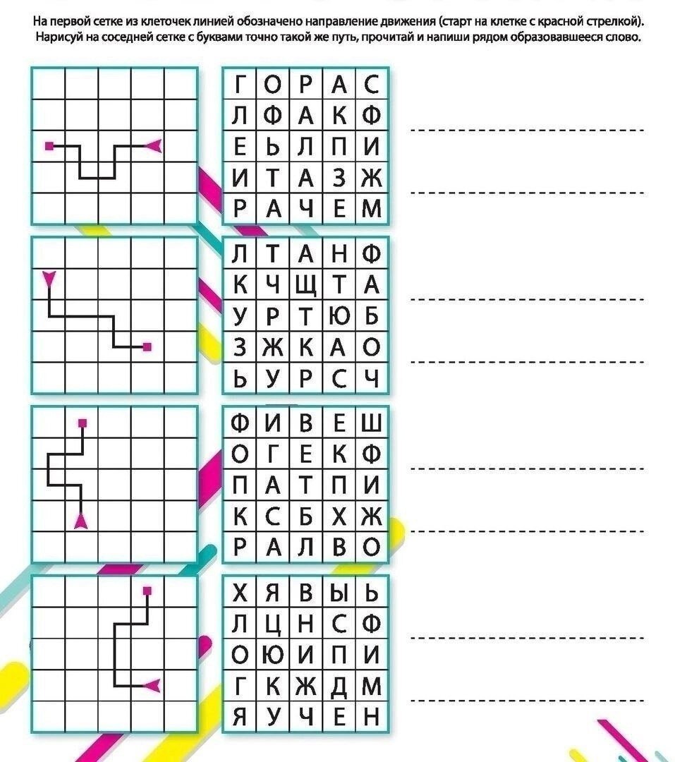 🌱На первой сетке из клеточек, линией обозначено направление движения (старт на клетке с красной стрелкой). 🌱Нарисуй на соседней сетке с буквами такой же путь, прочитай и напиши рядом образовавшееся слово.
