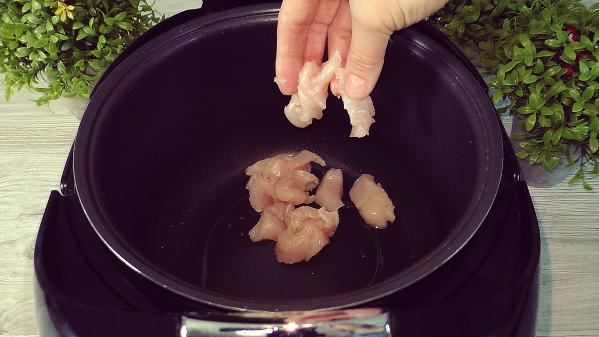 Я буду готовить суп в мультиварке, можно приготовить на плите, технология приготовления та же. Куриное мясо отправляем в чашу с небольшим количеством масла. Обжариваю до изменения цвета мяса на режиме «жарка». Минуты 3-4. Добавить лук и морковь, обжарить ещё пару минут, режим "Жарка" отключить. Добавляю картофель. Добавляю соль по вкусу. Залить всё горячей водой, я воды добавляю ориентировочно 1.7 л, так как у меня ещё в заготовке со щавелём есть жидкость.