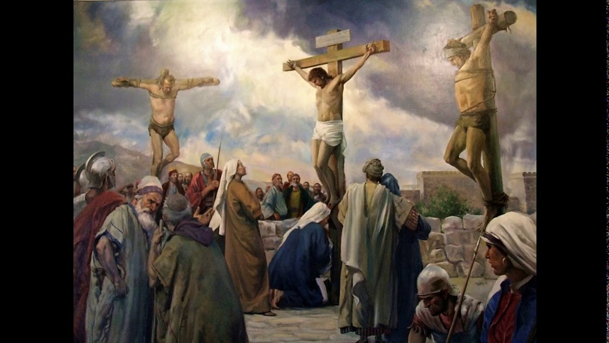 Их привели на Голгофу. Голгофа представляла из себя большой пологий холм. На ней уже лежали приготовленные для казни три креста. Сначала распяли Дисмаса и Гестаса, а затем – Христа, установив Его крест посередине двух разбойников.