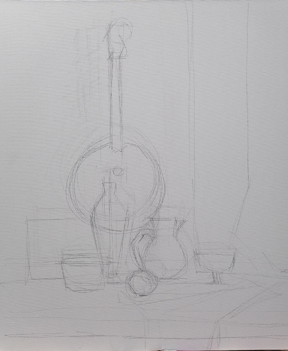 Продолжаем работу над натюрмортом. Напоминаю, что мы поставили натюрморт. Далее, выполнили форэскизы и самый удачный перенесли на холст. Подготовительный рисунок Итак, мы перенесли локальные пока несколько абстрактные пятна нашего натюрморта с форэскиза на холст. Это один из методов выполнения рисунка на холсте. В данном случае делали простым мягким карандашом, чтобы не царапать холст. И вот, что у нас получилось. Следующий этап работы над холстом заключается в уточнении пропорциональных, масштабных соотношений, постановки предметов на плоскость и проверки их относительно вертикальной оси. Важно уловить все характеристики каждого предмета. Рисунок выполняем линейно, переносим на изобразительную плоскость видимые контуры. А с помощью вспомогательных линий: овалов, осей - не позволяем предмету упасть или слепиться с другим предметом или с вертикальной плоскостью. Как раз наличие овалов в основании предметов позволяют нам проверить на своем ли месте все находится. Заостряю внимание еще р
