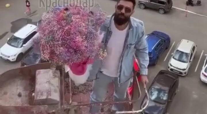 Краснодарец с большим букетом цветов гипсофил специально взобрался на подъёмник, чтобы подобраться к окнам возлюбленной и порадовать её сюрпризом. Романтичный момент запечатлела на видео его девушка.