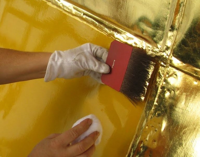 Грубая кисть очень хорошо растирает поталь в мелкие крупицы, они в свою очередь приклеиваются неравномерно, что прекрасно распределяется в зоне клея, как потертость.