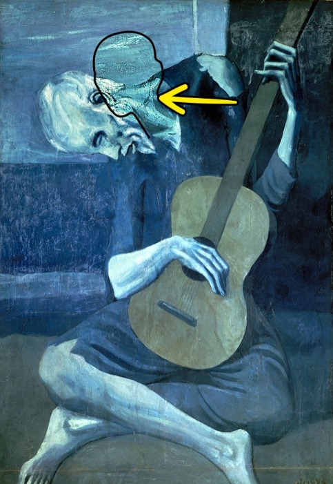 Из-за искаженной перспективы обычно все считают, что «Старый гитарист» - очень небольшое полотно. На самом деле, его размеры - 123 x 83 см. Закрытые глаза, отрешенность от всего мира и только инструмент в руках имеет значение. «Старый Гитарист» стал одним из символов в л