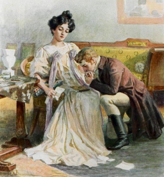 «Он не любил ее, когда она была сама собою: наивной, открытой. Он полюбил ее тогда, когда она стала холодной, когда не обращает на него внимания, когда «научилась властвовать собою». У него было много девушек до Татьяны, автор посвятил целых три строфы описанию поведения Онегина: «как рано мог он лицемерить», «таить надежду», «разуверять, заставить верить», «молить и требовать признанья». Вот и сейчас Онегин на коленях молит. О чем? О любви? Кого? Замужнюю женщину? Верную и честную?»
