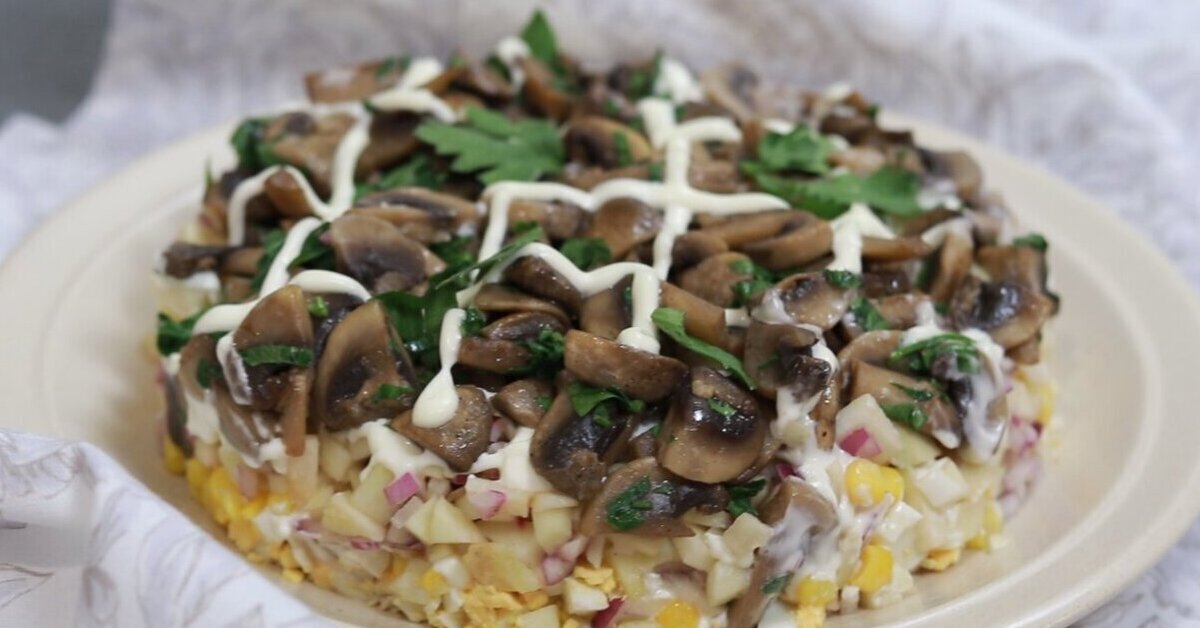 - 10 Выкладываем грибы с зеленью. Сверху рисуем сеточку из майонеза. Отправляем закуску в холодильник на 1 час для пропитки. Готово!