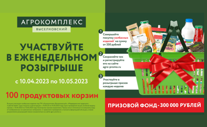 Торговая сеть «Агрокомплекс Выселковский» повторит акцию «Дарим 100 продуктовых корзин!». Её победители получат подарочные сертификаты, которыми можно оплатить продукты в любом фирменном магазине сети. По словам руководителя группы бренд-менеджмента дирекции по маркетингу «Агрокомплекса» Вилены Ялалтдиновой, в акции участвуют товары торговых марок «Агрокомплекс Выселковский» и Labinsk Beef, «Медвёдовские традиции» и «Дружба народов», изготовленные из охлаждённого мяса с собственных ферм агрохолдинга. «В этот раз мы сделаем вкусные подарки победителям акции на общую сумму триста тысяч рублей», — добавила Ялалтдинова. Так, номинал каждого подарочного сертификата составит 3000 рублей. А срок его действия продлится до 15 июня 2023 года. Чтобы стать участником акции «Дарим 100 продуктовых корзин!», нужно с 10 апреля до 15 мая купить в фирменной розничной сети «Агрокомплекс Выселковский» колбасные изделия или деликатесы, сосиски или паштеты на сумму от 350 рублей. Кассовый чек следует сохран